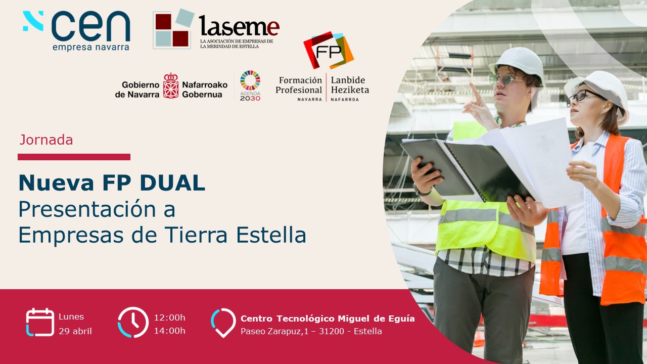 Esta mañana, en Tudela, se ha celebrado el primero de los encuentros de la gira con las empresas navarras que la Dirección General de Formación Profesional del Departamento de Educación ha programado para esta primavera en colaboración con la Confederación Empresarial Navarra (CEN), la Asociación Empresa Ribera (AER), la Asociación de Empresas de la Merindad de Estella (LASEME), la Asociación de Empresas de la Zona Media de Navarra (AEZMNA) y la Asociación de Empresarios de Sakana (AES). El objetivo de esta nueva iniciativa es presentar la nueva FP Dual al empresariado navarro.
