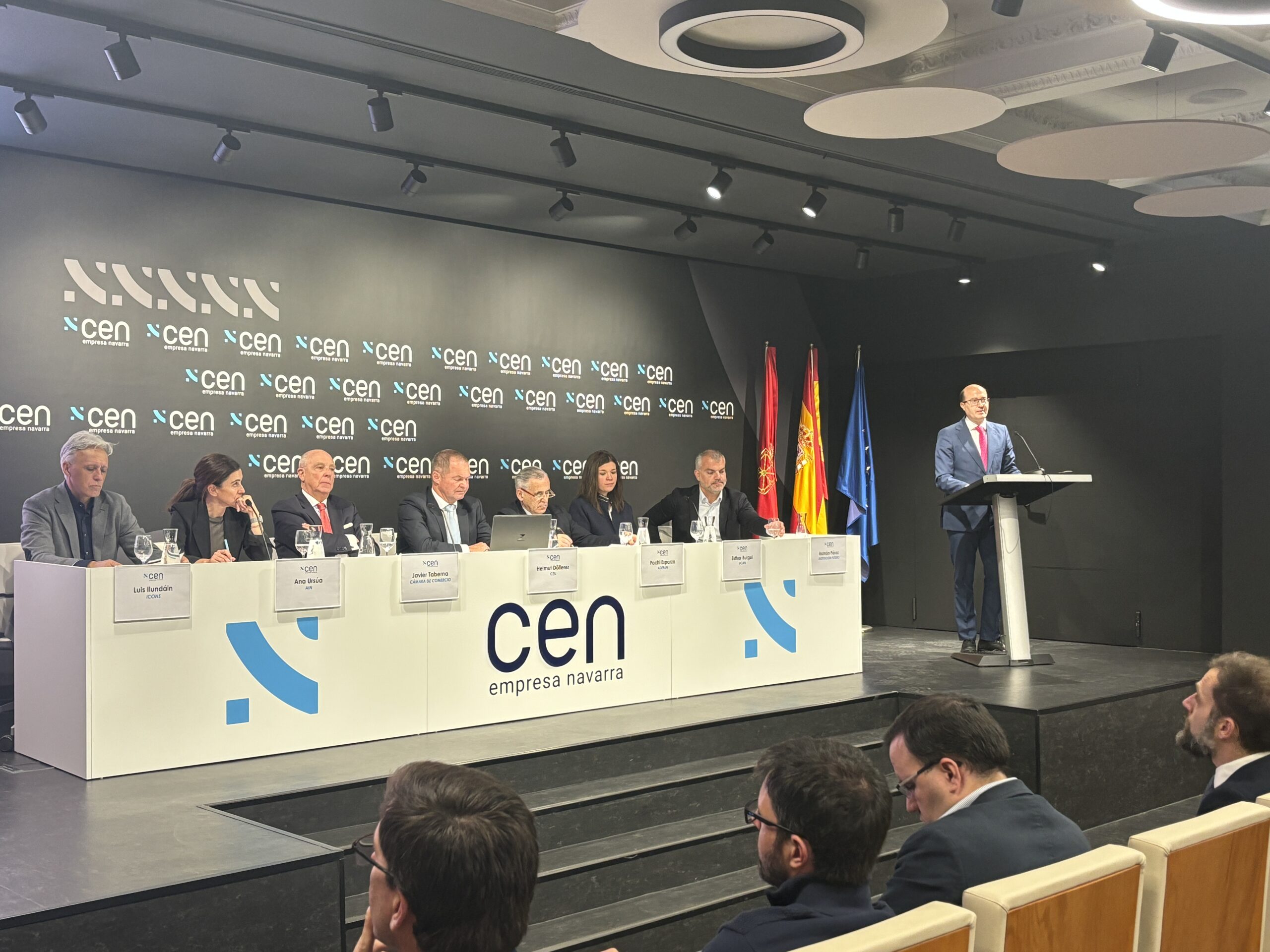 En la presentación pública del documento han participado: Helmut Döllerer, vicepresidente CEN; Javier Taberna, presidente de Cámara Navarra; Pachi Esparza, Secretario de ADEFAN; Esther Burgui, presidenta de UCAN; Ana Ursúa, directora General de AIN; Ramón Pérez, miembro del consejo de gobierno de Institución Futuro; Luis Ilundáin, vicepresidente del Cluster iCONS; y Carlos Fernández Valdivielso, secretario general de CEN.